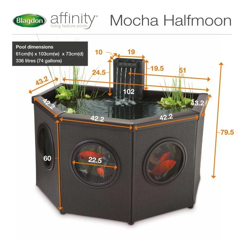 The Blagdon Affinity Half Moon Mocha Pool is the latest design with all the modern features including Led night lights waterfall 2 x planting baskets and Blagdon’s all in one Pond Pump Filter and UVC giving you the perfect water garden. The pond can be placed anywhere in your garden on decking or on a patio to create the perfect atmosphere day or night.