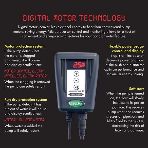 The new Amphibious IQ Variable Flow energy saving pond pump 3000-6000 for filters and waterfalls. The new variable flow pumps come with the latest digital motor technology and microprocessor. As the flow is adjusted the wattage also adjusts saving on electricity. The pump features motor protection technology that pauses the pump if blocked or jammed preventing the motor overheating. Other protection systems include run dry and soft start. The digital control panel shows you the current pump settings and also displays any fault-errors allowing you to easily adjust or stop the pump.