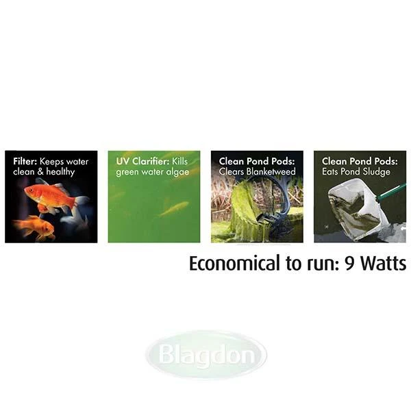 The Clean Pond Machine is a very effective easy-to-use filtration system that keeps your pond clean and healthy. With its unique innovative foam-free design to give you a filter that deals with and prevents the issues that come with pond-keeping. When used with blagdon’s clean pond pods placed directly in to the 7000-filter dosing system the soluble pouches get to work straight away adding bacteria and other active ingredients to clean and clear your pond. Clean pond pods are pet and wildlife safe and reduce filter cleaning encourage plant growth boost bacteria and reduce sludge. They can also be used directly in to the pond and with other filter systems. Six pods are included with your filter.