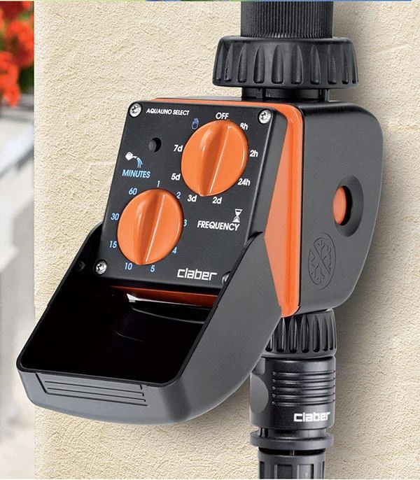 Claber Aquauno Select Timer 8423 one-way automatic timer with 63 pre-set programmes + off and 5-minute test.Easy programming just rotate the two dials one for the time and one for the how often. Battery-operated so no electrical connections required just screw it onto the tap.