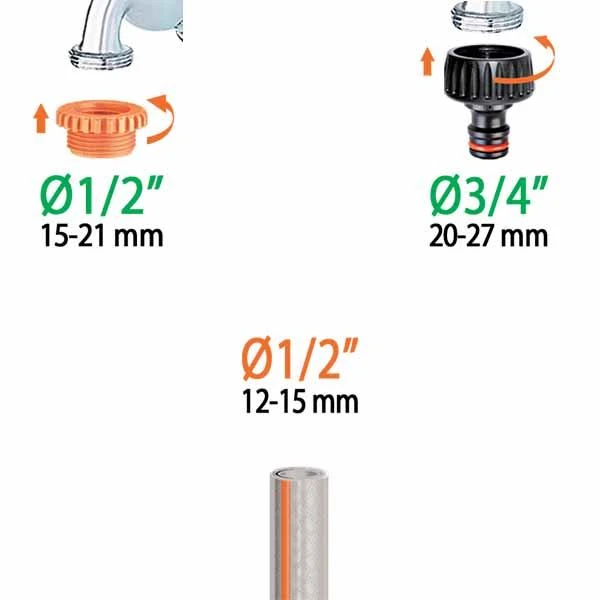 The Claber 15 Meter Hose Pipe Kit has everything needed to use straight away just connect to your tap. This hose kit is complete with a tap connector for 1/2″ or 3/4″ tap outlets, quick connect couplings one with stop and a spray nozzle for watering.