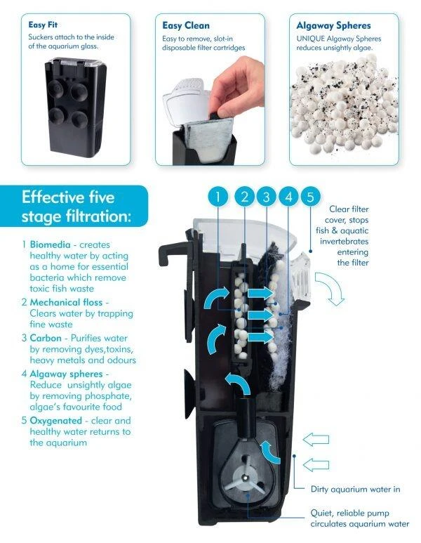 The Mini CF filter has all the features needed to keep your aquarium clean and healthy. This supper quite filter will keep your water balanced with the ceramic tubes creating the perfect environment for good bacteria to flourish. Along with cleaver algae prevention spheres and mechanical floss cartridges to sieve out waste and active carbon purifying the water all help keeping the algae at bay. Cleaning your filter couldn’t be easier with an easy flip up hinged lid and easy replacement cartridges simply pop in and out saving time minimising maintenance.
