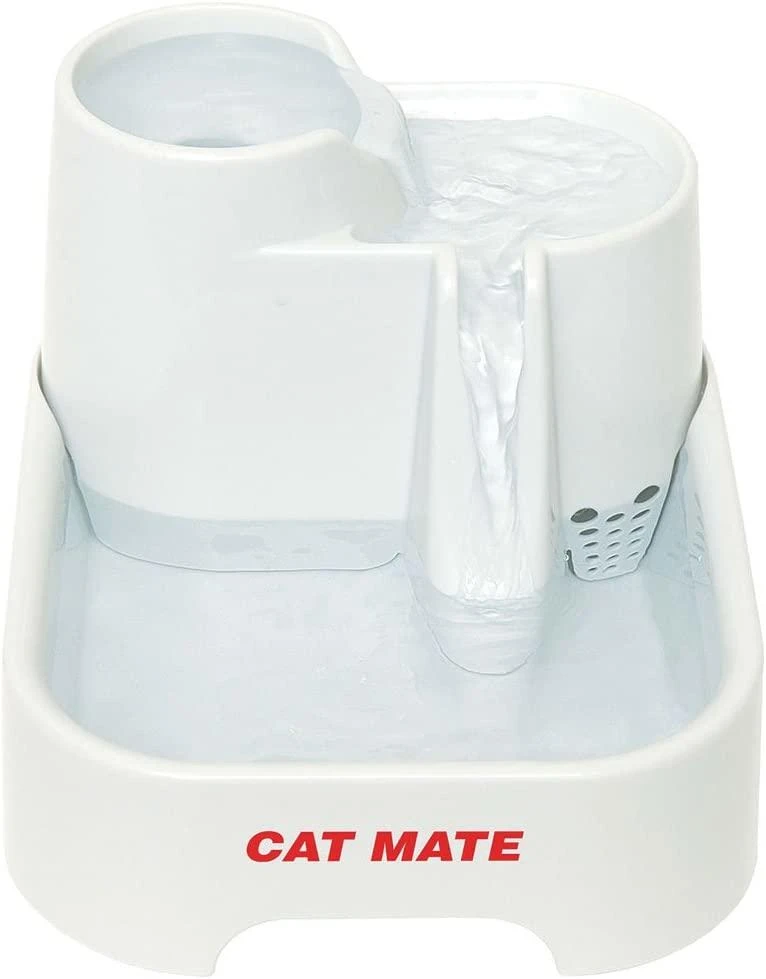 The Cat Mate pet water fountain has 3 levels making it easily accessible for cats and small dogs. Pets love to drink from moving water and the and with three tiers and a hidden pump to circulate the water this water fountain will keep them happy and hydrated. The ramp between level’s reduces splashing and the included polymer carbon filter keeps the water purified.